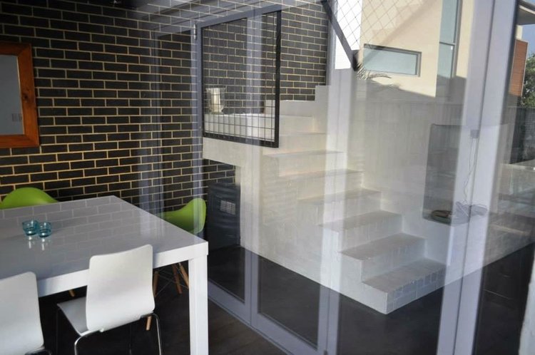The internal spaces are located around a light void over the staircase. This allows light back into the bathroom to the north and bedrooms to the south, with light spilling down into the kitchen and living spaces. Filtered and direct light is used to open internal spaces and create a feeling of openness belying the narrowness of the site.