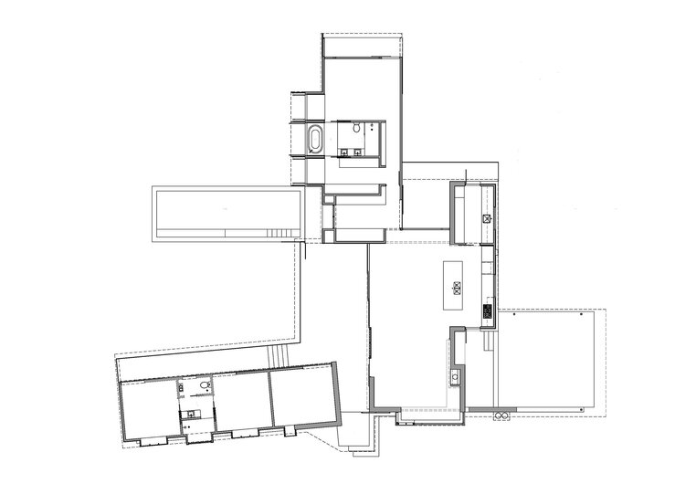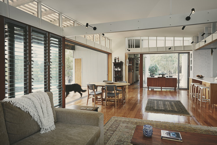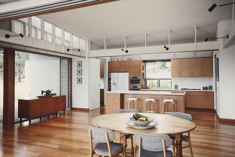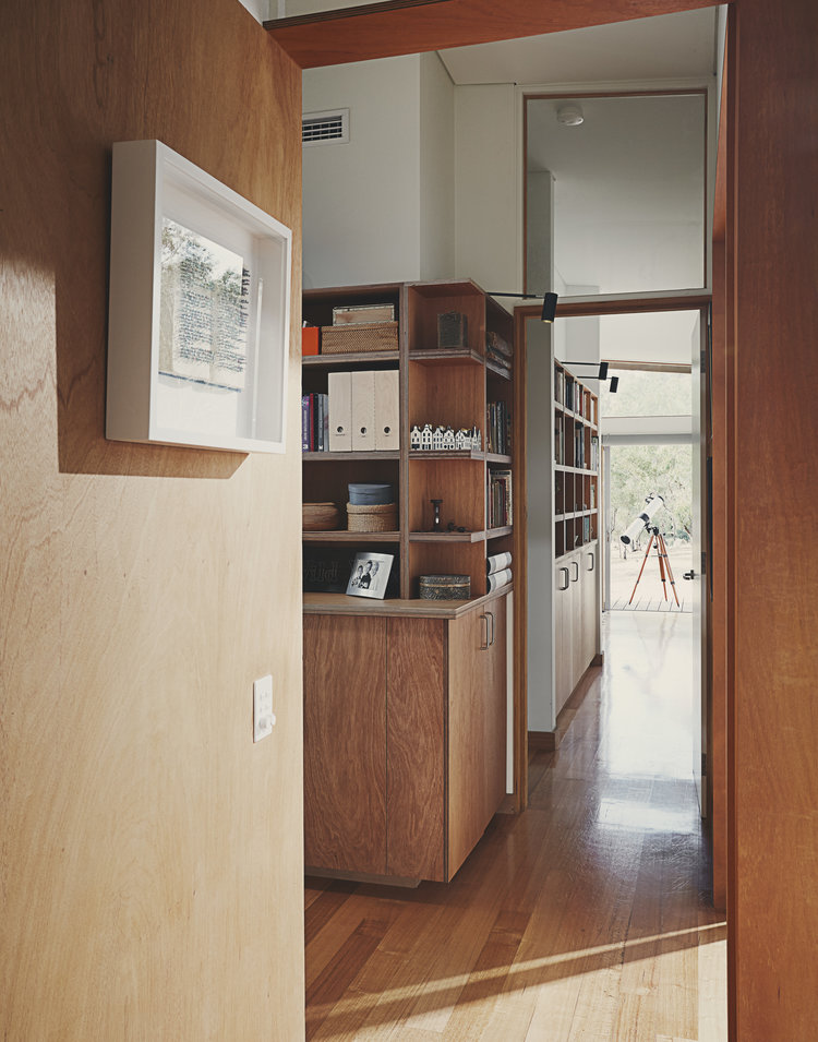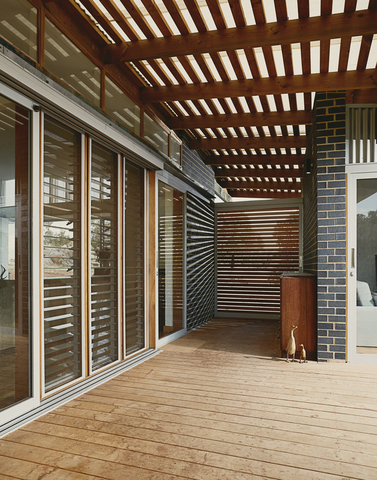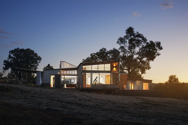 The Mindalong House occupies a semi-rural block on the edge of John Forrest National Park, at the base of the Darling Scarp. Views of the horizon, punctuated by existing granite rock formations and scattered trees, penetrate to the heart of the central living spaces. Two shed-like wings surround the communal ‘campsite’ gathering area, conceived as a ‘cathedral of light’. The timber decks exist at the threshold, and extend from these dispersed living spaces, allowing access throughout the building. The communal gathering area breathes through two passive light/air movement towers, regulating the internal climate. The poetics of Mindalong House are a strong shed with sculptured entrance by day and a series of light boxes in the landscape by night.
