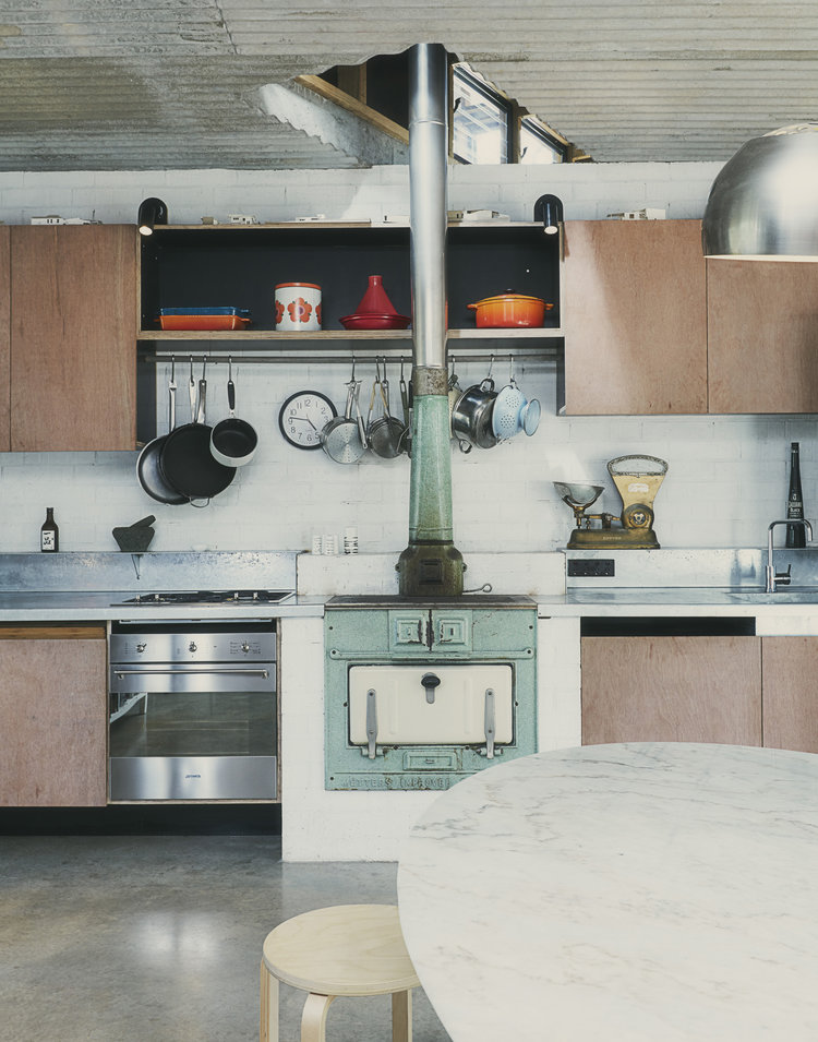 The tower, study and tea room, allow different perspectives of the landscape and proximity of the river and flood plain with the roof giving the sense of shelter and enclosure, even though there are no walls. The body is continually being turned to open up to the hills beyond. At the lower level you arrive through a door with no thresholds and into a multi functioning room of cooking/eating/resting/reading/listening with two large externally sliding doors that slide past their thresholds. The house moves pushes out against the lands contours while the climate run with the contours.