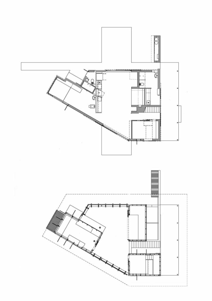 Doors open up and you discover a wet room and bathhouse with fly roof over as ceiling and outside allowed to breathe with these internal spaces. The alternative is access to external stairs up to an external covered space with access to the three rooms off this communal area.