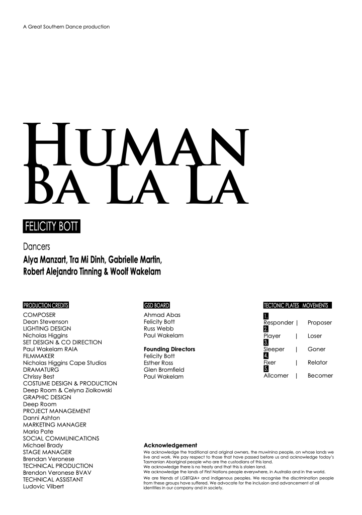 Driven by outstanding professional contemporary dance, Human Ba La La has one eye on our pasts and the other on our here and now. This stirring Tasmanian premiere harnesses the visual and narrative power of film, sound, set and lighting to live performance by international dancers in their prime and back on shore.