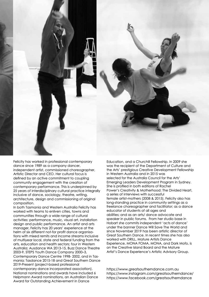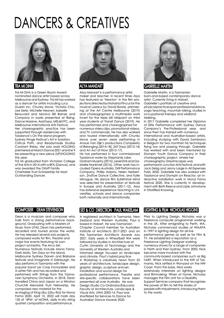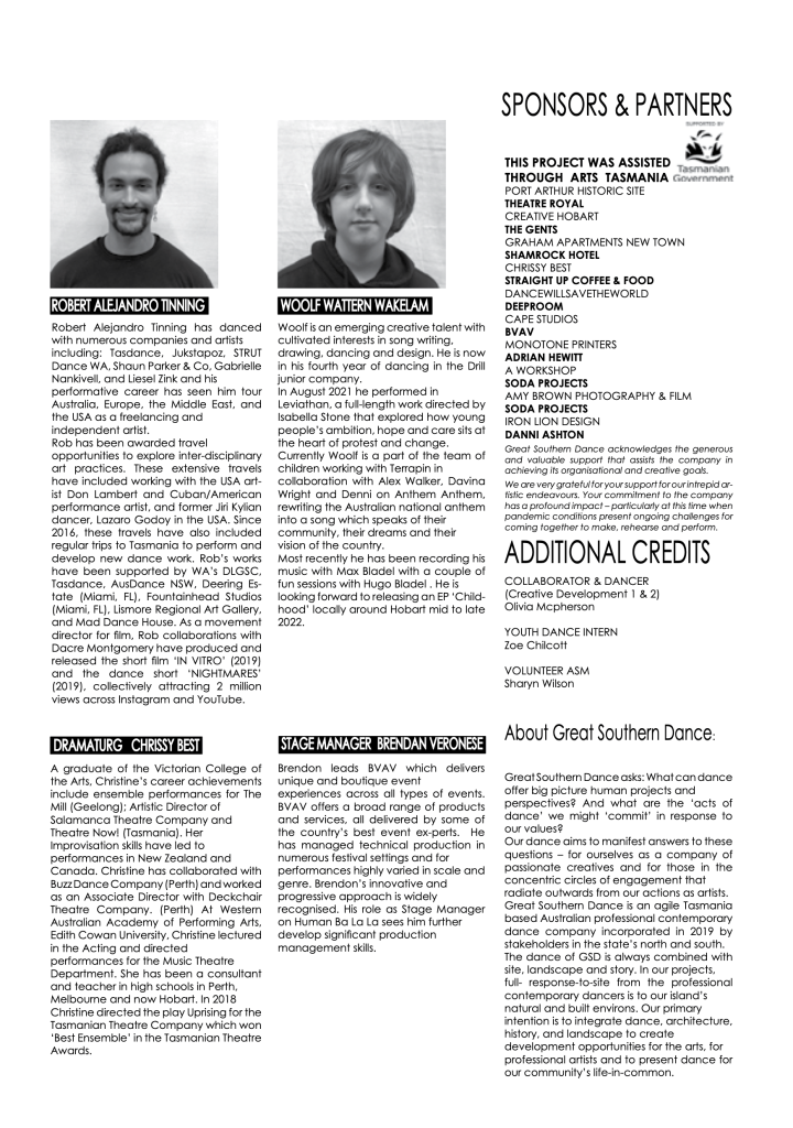 Alternating between chaos and calm are four humans dancing for their lives and times. They’re pushing through with an open-hearted, full-bodied tackle of our ‘not-listening’, ‘not-seeing’ human traits. They’re looking out from the prison of their worldview onto breathtaking landscapes. They’re swinging between exertion and exhaustion. They’re messing up their island, their minds, their world. Mostly, care eludes them. Audiences bear witness as these crash test dummies ride their highs and their lows towards glimpses of agency and, ultimately, another chance to arrive again.