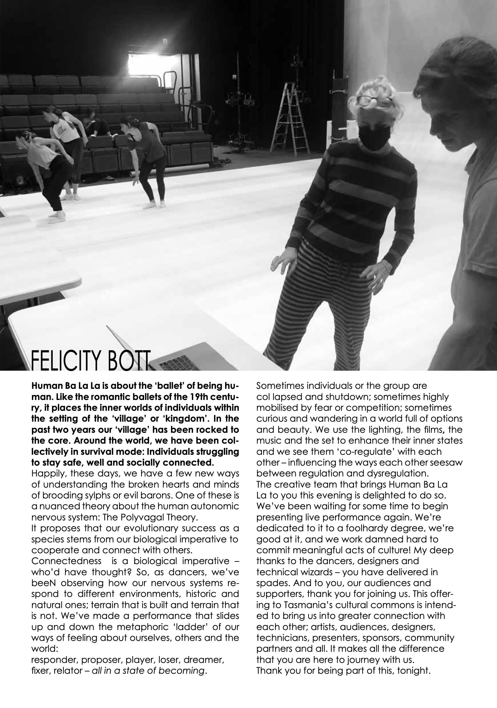 Driven by outstanding professional contemporary dance, Human Ba La La has one eye on our pasts and the other on our here and now. This stirring Tasmanian premiere harnesses the visual and narrative power of film, sound, set and lighting to live performance by international dancers in their prime and back on shore.
